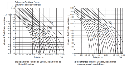 Fabricantes de rolamentos costumam fornecer tabelas para auxiliar os seus usuários a determinar o período de relubrificação aceitável, sem oferecer riscos de falhas aos seus rolamentos. Estas tabelas geralmente são válidas para graxas a base de sabão de lítio de boa qualidade e óleo base mineral operando em condições normais de trabalho e em temperatura operacional de 70°C. Por isso, ajustes técnicos com base nos fatores operacionais e no lubrificante que está em uso não podem ser negligenciados.